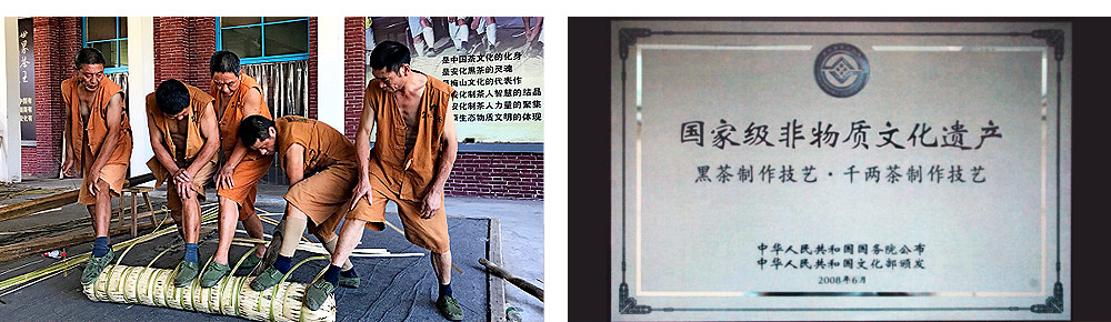 在雪峰山脈這片神奇的土地上,秀麗的風(fēng)光和適宜的氣候孕育出享譽(yù)世界的安化黑茶,其中較具代表的千兩茶堪稱安化黑茶“一絕”?!盎镉?jì)們咧,把杠抬啰,齊心壓咧,用力踩呦,呦嗨!”在這原生態(tài)的帶有濃郁茶文化氣息的踩茶號(hào)子中,粗獷的男性力量與黑茶原始野性完美融合,貫穿于神秘千兩茶的每一道古老手工工序中,又經(jīng)日曬夜露,吸天地之靈氣,納宇宙之精華于茶體,讓你猶如身臨遠(yuǎn)古秘境,領(lǐng)略千兩傳奇風(fēng)采。