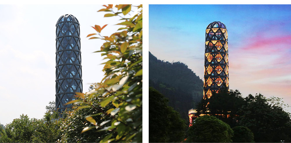 中國(guó)目前唯一的黑茶標(biāo)志性景觀建筑。建成于2016年,總造價(jià)約450萬(wàn)元,占地面積3500平方米,總建筑面積180平方米。景觀塔位于安化縣百里畫廊風(fēng)光帶、白沙溪茶廠西側(cè)小山丘上,南抵省道S308線,北臨資江。塔高27.5米,共7層,由塔座和塔身兩部分組成。塔座呈八邊形,仿千兩茶底座設(shè)計(jì),為前廳和設(shè)備層;塔身呈園形,仿千兩茶花格篾簍外觀設(shè)計(jì),塔內(nèi)有螺旋式階梯而上,一至六層為游客觀光層,七層為茶室和接待室。景觀塔創(chuàng)作思路源于“世界茶王”千兩茶,景觀與觀景雙重功能結(jié)合,設(shè)計(jì)方案導(dǎo)入傳統(tǒng)塔式建筑的構(gòu)造特點(diǎn),傳統(tǒng)文化諸如壯風(fēng)水、鎮(zhèn)地脈、束水口、開文峰等意識(shí)形態(tài)為景觀塔鍍上一層神秘色彩。最有現(xiàn)實(shí)意義的是,該塔通體透亮,視野開闊,游客可信步登臨盤旋而上的扶梯逐層欣賞安化山形水色,領(lǐng)略白沙溪黑茶文化產(chǎn)業(yè)園區(qū)全景。每當(dāng)夜幕降臨,千兩茶王景觀塔放射出絢爛光芒,格外美麗。有詩(shī)云:玉柱臨風(fēng),茶王展世界;步步高升,塔中看天下。