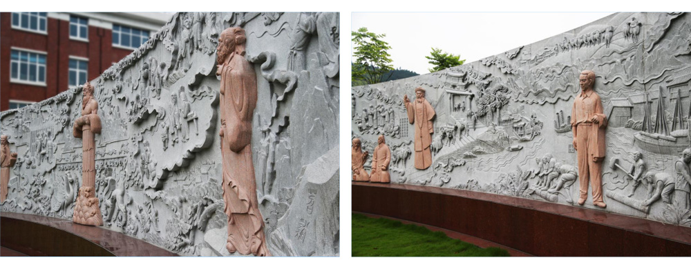 西邊浮雕“千年茶事”,以安化千年茶史中的人物故事為題材而創(chuàng)作的。中心位置主要人物是清代重臣陶澍。陶澍(1779-1839),字子霖,號(hào)云汀,湖南安化小淹人,清嘉慶七年(1802年進(jìn)士,清代經(jīng)世派主要代表人物,官至兩江總督加太子少保,對(duì)安化茶的推介和發(fā)展做出過(guò)重要貢獻(xiàn),并有多首以家鄉(xiāng)茶事為題材的詠茶詩(shī)作傳世,尤以《芙蓉江竹枝詞》膾炙人口,是將安化茶推薦給朝廷,成為皇宮御飲的功臣。浮雕左側(cè)是以白沙溪茶廠創(chuàng)始人、中國(guó)黑茶理論之父彭先澤先生為線素創(chuàng)作的人物作品。其研制生產(chǎn)出第一片黑磚茶,開創(chuàng)了中國(guó)緊壓茶生產(chǎn)的新紀(jì)元。浮雕右側(cè)上部是清代安化籍書法大家、實(shí)業(yè)家、翰林院編修黃自元人物故事。下部雕刻的人物是安化籍清代云貴總督羅繞典與次子小溪。羅繞典生育二子,長(zhǎng)子小蘇,次子小溪。羅繞典教育小溪不取仕途,以經(jīng)營(yíng)安化茶葉為生,對(duì)安化茶的發(fā)展做出了一定貢獻(xiàn)。