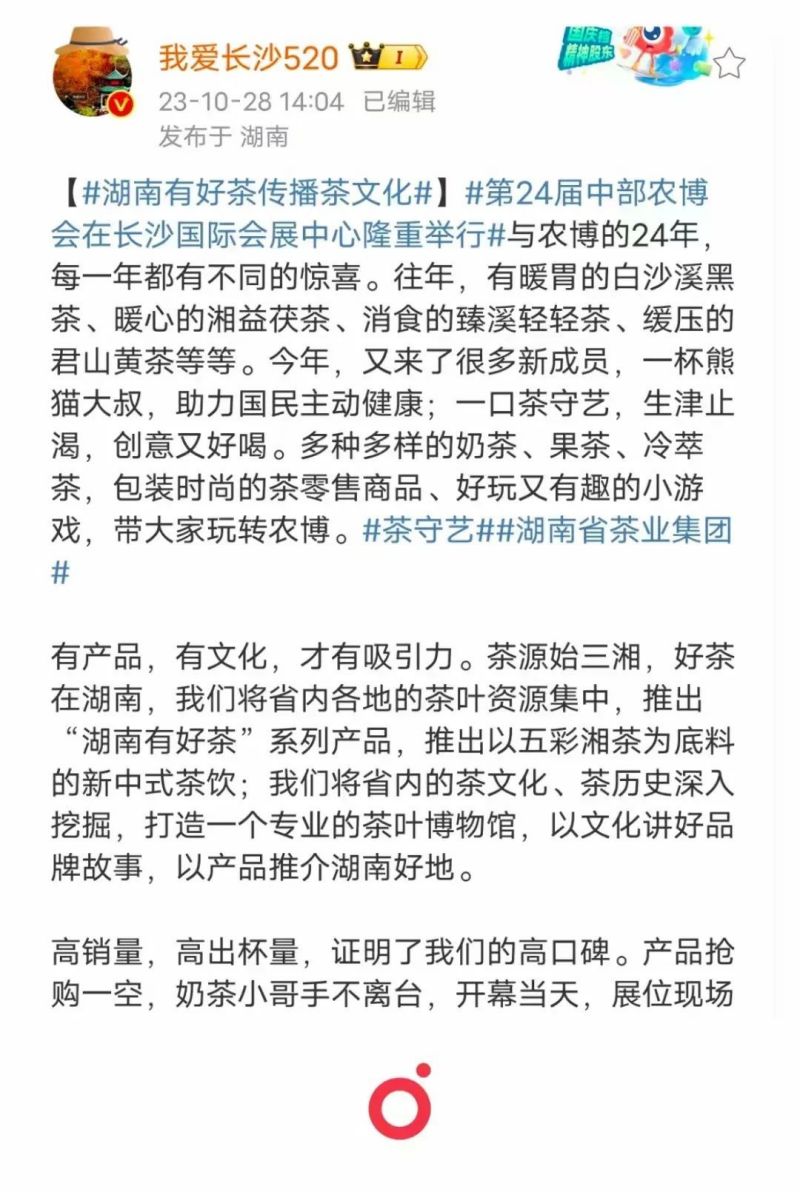 此次農(nóng)博會,集團(tuán)一是繼續(xù)借助人民網(wǎng)、湖南日報、紅網(wǎng)、長沙晚報、湖南衛(wèi)視、湖南都市、長沙電視臺等傳統(tǒng)媒體,以高質(zhì)量高吸睛度的圖文報道和當(dāng)下流行的短視頻報道增強(qiáng)品牌、產(chǎn)品、渠道宣傳力度。二是繼續(xù)利用自身官方網(wǎng)站、微信公眾號、視頻號、小紅書等新媒體同步轉(zhuǎn)發(fā)媒體報道和原創(chuàng)相關(guān)內(nèi)容,借助媒體高影響力和高關(guān)注度提高公司自有媒體平臺的粉絲和流量。三是加強(qiáng)與 我愛長沙、 嘉俊日記簿、 三湘頭條等網(wǎng)絡(luò)大咖的聯(lián)動,通過微博、百度、今日頭條同步宣傳推介集團(tuán)品牌產(chǎn)品,集團(tuán)參加此次農(nóng)博會情況登上長沙同城熱搜,“湖南有好茶傳播茶文化”話題討論熱度持續(xù)上漲。四是借力來展位打卡的網(wǎng)紅和名人如湖南衛(wèi)視著名新聞主播魏哲浩、湖南衛(wèi)視知名主持人杜海濤等,進(jìn)一步吸引消費(fèi)者、擴(kuò)大茶產(chǎn)品銷售、提升品牌影響力,實現(xiàn)了人氣、銷量、口碑三豐收。
