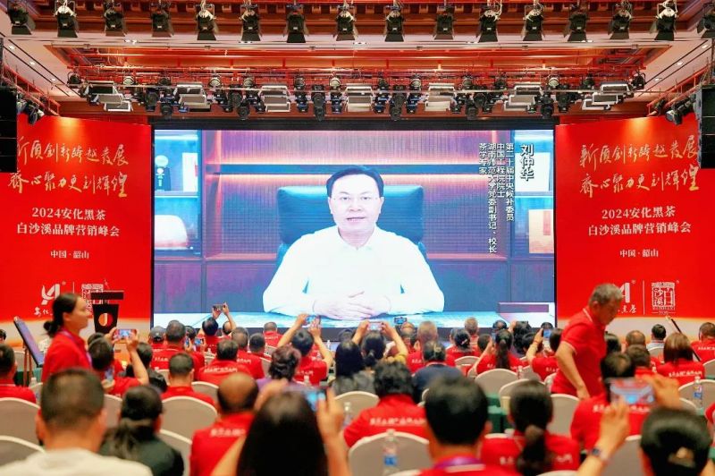 白沙溪副董事長劉新安,安化縣委常委、宣傳部部長廖小甫,益陽市茶業(yè)協(xié)會黨支部副書記匡維波,湖南省茶業(yè)協(xié)會會長、集團(tuán)公司董事長、白沙溪董事長周重旺先后致辭。第二十屆中央候補(bǔ)委員、中國工程院院士、湖南師范大學(xué)黨委副書記、校長劉仲華特別為峰會作視頻講話。白沙溪總經(jīng)理孟濤作《安化黑茶白沙溪品牌2023-2024工作報告》。