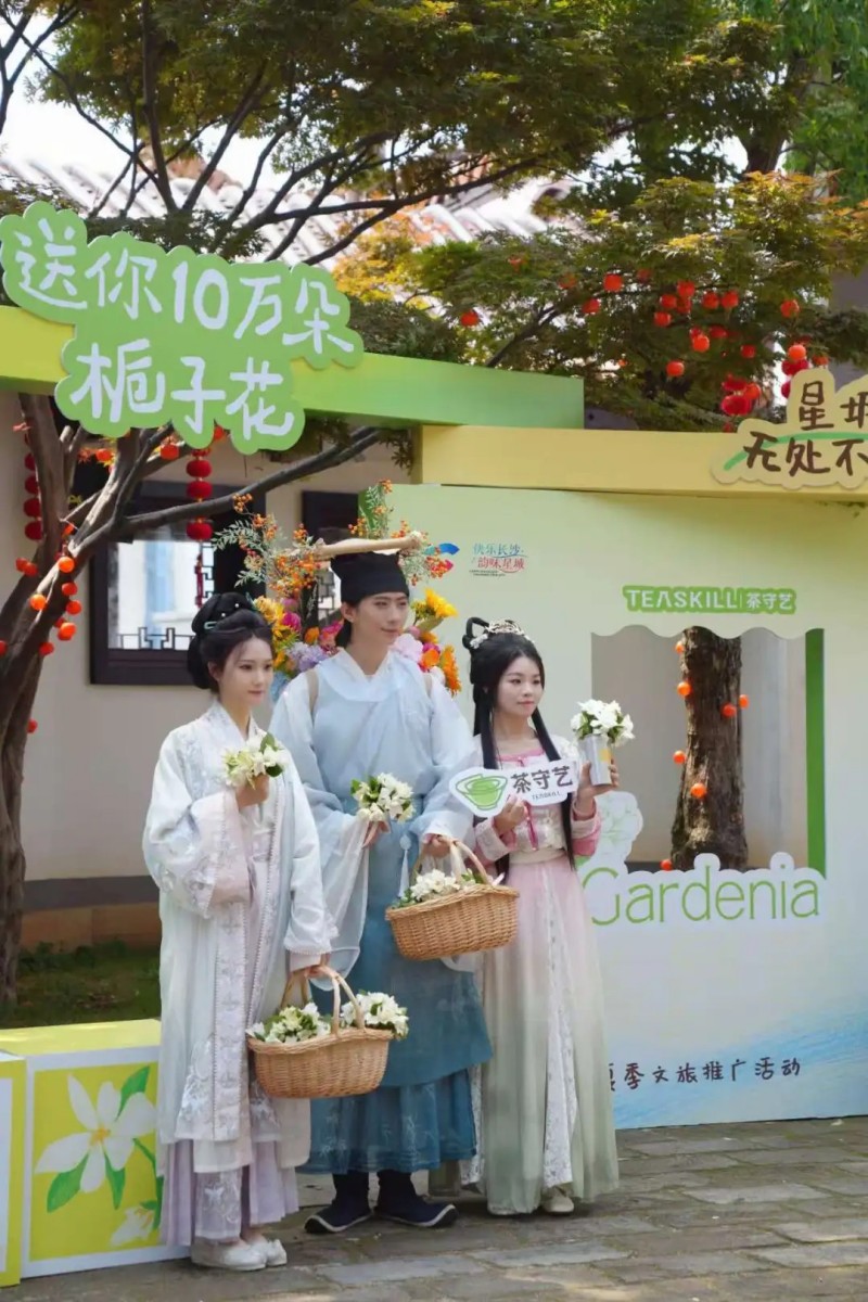 走進活動現(xiàn)場,主會場天心閣內(nèi)彌漫著濃郁的梔子花香。簪花郎NPC與游客熱情互動,古風(fēng)美女手持梔子花隨機派送,將浪漫氛圍推向高潮。茶守藝旗下各門店更是化身“梔子花園”,入口處、茶臺、櫥窗皆被新鮮梔子花精心裝點。顧客踏入門店,即可自由領(lǐng)取花朵,或贈予他人傳遞溫暖,或帶回家中珍藏美好。